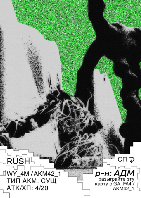 RUSH — это бренд, который можно описать термином «коллекционная карточная система». RUSH повествует о Санкт-Петербурге, о людях, живущих в нём, о событиях, происходящих на улицах и сценах города.