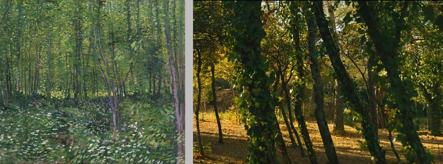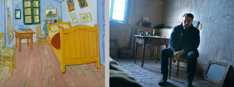 Первые кадры напоминают ранние реалистические полотна Ван Гога, а вторые — более поздние работы, яркие и свободные, выполненные в духе постимпрессионизма. В то же время, окружение в фильме гармонирует с состоянием самого художника, возможно, даже диктует его. Интересно проследить, как окружающий мир воздействует на внутренний, который, в свою очередь, отражается на холсте.