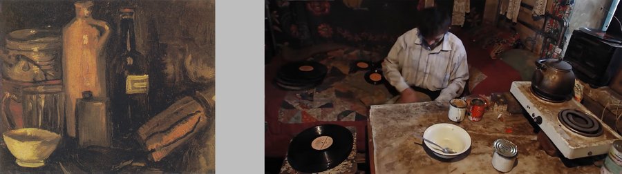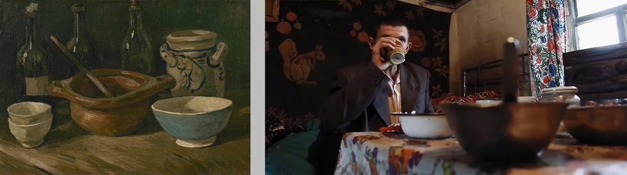 При рассмотрении кадров бедно, даже неряшливо обставленного стола можно вспомнить многочисленные натюрморты Винсента.