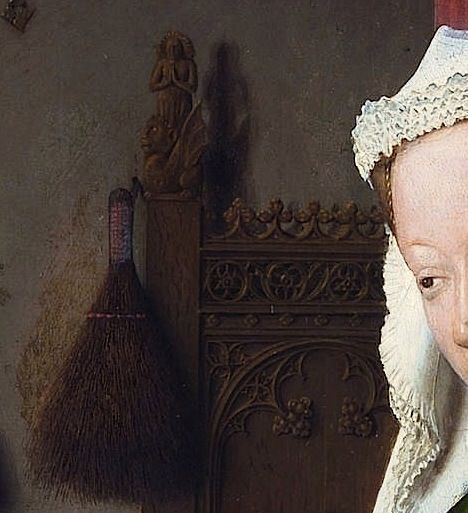 Множество предметов в комнате несут аллегорический смысл: собака у ног супругов — символ супружеской верности, апельсины — райского блаженства, метла — домашней чистоты, статуэтка святой девы над кроватью — женского покровительства, а сама кровать намекает на тему продолжения рода.