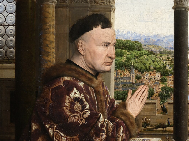 Ключевые детали — его высокий лоб, морщинистое лицо, тяжелый взгляд — не скрывают возраста и опыта, а напротив, усиливают впечатление властности, деловитости и внутренней энергии. Ролен сидит лицом к Мадонне, сжатые губы выражают чувственную сдержанность и деловой характер.