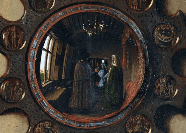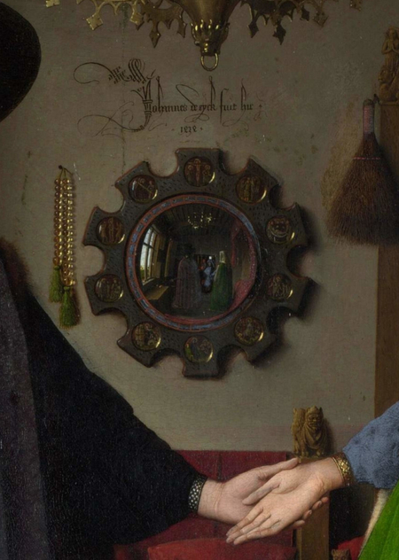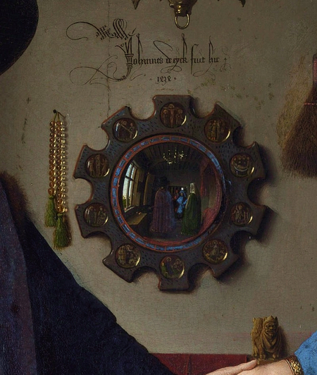 Ян ван Эйк — мастер Северного Возрождения — в картине «Портрет четы Арнольфини» превосходит готических мастеров в пристальности и точности натурного изображения. Художник с усердием и тщательностью прорабатывает каждую деталь, приближаясь к иллюзии реальности и добиваясь зеркального отражения. На картине ван Эйка запечатлено мгновение реальности. Зеркало — центр композиции. Зритель сразу обращает на него внимание. В отражении запечатлена сцена бракосочетания с обратной стороны. В конце комнаты также можно увидеть самого художника и еще одного неизвестного свидетеля происходящего.